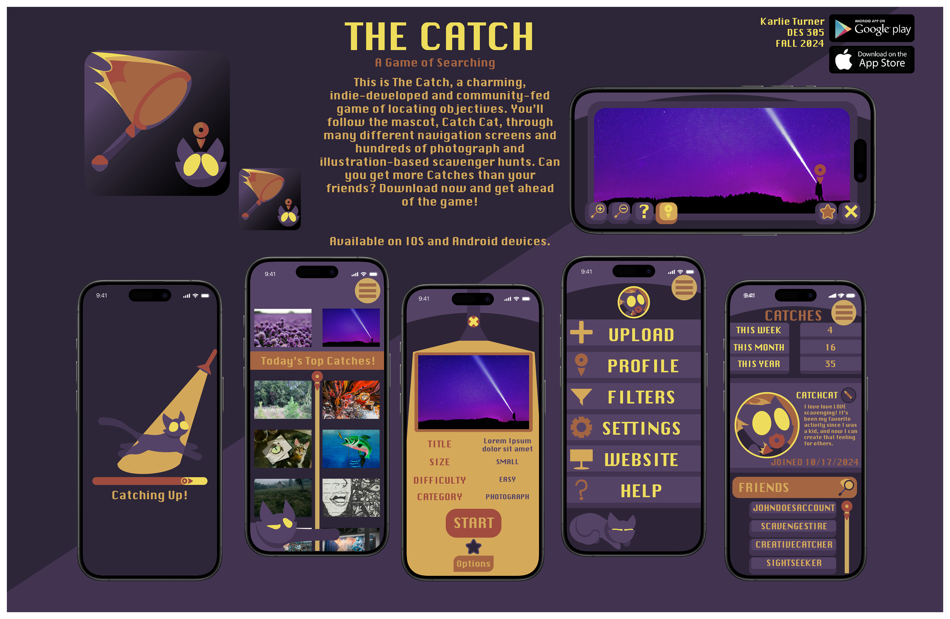 A mobile game focused on searching through pictures, The Catch uses an adorable mascot to guide you through various artworks and photographs as you follow prompts and find the target. Relaxing colors and calming visual elements were the main focus of this project.